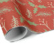 This gift wrap features a botanical design with leaves, holly, branches, wreaths and red berries against a rich red background.