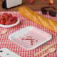 This design features modern Christmas paper plates with a soft pink background and a deep red hand-drawn bow. Personalise with your family's name.