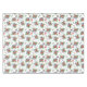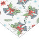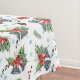 Here's a pretty Holiday season table cloth that features silver bells and holly sprigs tied with a bright red bow. In the repeated pattern, along with the bell images are red poinsettia blossoms, pine cones, red berries and blue snowflakes. The pattern is placed on a snow white background.