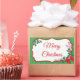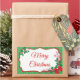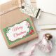 This bright and colourful sticker will brighten up any Holiday correspondence or package. It features your custom text in red script at the centre of a white ornate banner, which is lined in red. At the top left and bottom right of the frame are pretty holly sprigs with red berries. The bottom one is decorated with a red bow. Everything is placed on a mint green striped background. Festive!