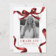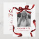 Celebrate your graduate's milestone with our simple yet elegant graduation party invitations. Each card features a striking white background, garnished by a photo of your grad framed by a classic red watercolor bow and ribbon. Flip it over for the party information that is easy to personalise.