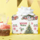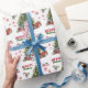 The repeated pattern on this Christmas wrapping paper includes an image of a beautiful Siberian Husky dog wearing a festive red bow. The dog sits in front of a decorated Holiday tree. Stylised red and green text says MERRY CHRISTMAS", and your own signature is in two fields for you to customise. Other images included in the pattern include red decorative snowflakes, candy canes, and a peppermint lolly pop.