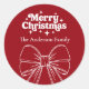 A red background, white text and hand-drawn bow. Merry Christmas is written with an elegant hand-lettered style script. Personalise and add your family name.