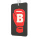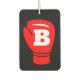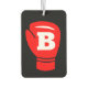 Red boxing glove with custom monogram hanging car air freshener. Personalised gift for boxer or sports coach.