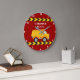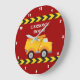 Cool custom construction vehicle birthday party wall clock for a child who loves yellow dump trucks in yellow and red. Fun vehicle bedroom decor for a little boy who loves cars and trucks. Customise with your kid's name under the black and yellow caution tape for a boys room.