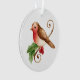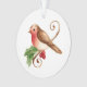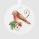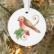 This ornament features a delicate watercolor illustration of a red-breasted robin perched gracefully on a sprig of holly, complete with vibrant red berries and curling vines.