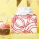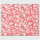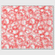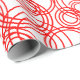 This wrapping paper has a mid-century modern design of red concentric circles scattered about the whole design.