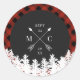 Rustic buffalo check wedding sticker with white winter trees painted at the bottom against a red plaid background. Add your initials and wedding date to a crossed arrow monogram.