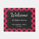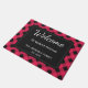 A stylish and eye-catching doormat with a red buffalo plaid design. The buffalo check pattern forms an attractive surround to the central section, which is dark charcoal with white text. The wording begins with 'Welcome' at the top in script typography. Below this, the mat can be personalised with your address, name(s), and date 'established' at this residence. An ideal housewarming gift and a charmingly warm welcome for your guests.