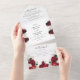Display all the details of your wedding with this elegant 'All in One' wedding invitation, featuring a classic white background, black calligraphy and cursive font and an array of red burgandy and white floral roses with faux gold accents and green foliage. Guests can easily tear away the RSVP postcard and pop it in the mail! Easily edit all of the information with your wedding details using the template provided. Affordable all-in-one wedding invitations that will wow your guests.