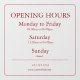 Make your business hours clear and stylish with this customisable Window Cling! Perfect for storefront doors and windows, this reusable cling displays your opening hours with a clean, professional design that catches the eye. Easy to apply and remove without residue — ideal for shops, cafes, salons, and offices.