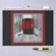 Photo of an old-fashioned heritage steam train chugging along the narrow gauge tracks. Black and white photograph except for the red caboose. Photo taken in Castlemaine Australia, and I believe includes Tait or "swingdoor" carriage cars and coal burning steam engine and tender.
