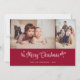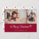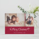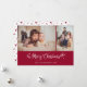 Custom red Merry Christmas photo cards featuring two photos with a calligraphy title on the front and red stars on a plain white background at the back. Easily personalise these red calligraphy Christmas photo cards with your images, a family name and the year.