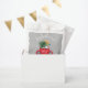 Watercolor graphic features retro red coloured beetle style car loaded on top with freshly cut Christmas tree and colourful wrapped presents. Customisable holiday greeting with room for your family or business name.