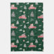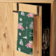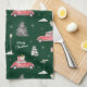Add a custom touch to your home holiday decor with this seasonal Merry Christmas pattern kitchen towel. Towel has red cars, presents, snow, trees, and white snowflakes. The background is green. Custom text may be edited per your preference and currently says "Merry Christmas!"