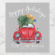 Watercolor graphic features retro red coloured beetle style car loaded on top with freshly cut Christmas tree and colourful wrapped presents. Customisable holiday greeting with room for your family or business name.