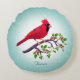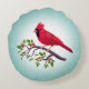 Beautiful red cardinal standing on a tree branch on teal background Round Pillow. Text, only on the front side, can be personalised.