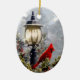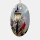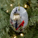A beautiful red cardinal on a snowy winter evening decorates this Christmas ornament.