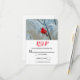 An RSVP card with a scenic nature photograph featuring a bright red cardinal. Contrasted against a winter backdrop with snow gently falling down.