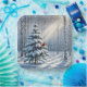 A serene winter scene depicts a snow-covered forest with a lone evergreen tree adorned by a bright red cardinal bird