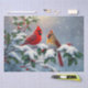 A pair of northern red cardinals perch on a holly branch covered with red berries and snow.