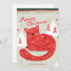 Cute Christmas card with a retro vibe featuring an illustration of a red cat and a text "Meowy Christmas". Perfect for cat lovers. Customise this card with your name. Original artwork by Marketa Stengl.