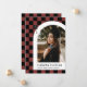 This modern and unique graduation announcement features a dark red and black chequered background highlighting a photograph of the graduate framed in a white arch with the graduate's name and school beneath. A small gradation cap is cleverly displayed in the checked background with the graduate's graduation year. The back has a fun matching checked pattern in maroon and black.