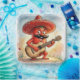 A cheerful cartoon red pepper wearing a sombrero strums a guitar, radiating a playful and whimsical vibe