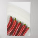 High angle view of five red chilli peppers in a plate. Copyright: Glowimages
