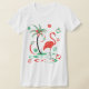 A fun, festive, flamingo design with a retro touch in red and green. A red flamingo wades in the water next to a palm tree decorated with Christmas baubles and ribbon. A customisable design for you to personalise with your own text, images and ideas. An original digital art image created by Jess Perry.