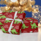 Awesome green dinosaur Christmas wrapping paper. This apatosaurus looks very cute in a holiday red Santa hat with a little smile. I like prehistoric Christmas animals and presents that kids will love. Customise this gift with the recipient's name to make it even more personalised.