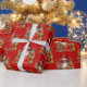 Wrapping paper with a cosy Christmas image featuring a red lantern surrounded by pine and a poinsettia and holly.