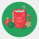 A festive green Holiday stickers with a red cocoa mug topped with yummy marshmallows and extra chocolate and one candy cane . Also there is a star-shaped gingerbread cookie on the side and 2 Christmas ornaments on the left . They're ideal to embellish presents , to close a goodie bag or to use as envelope seal .