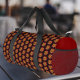 Travel or head on down to the gym in style with this small duffle bag that features an image of a red collarette Dahlia flower printed in a repeating pattern on black background along with solid, dark red trim on side ends of bag. A fun, floral design!