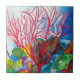 From an original artwork painting in watercolour by Sacha Grossel of fire coral red coloured coral and colourful lichen rocks from the Great Barrier reef. This special coral reef under the sea ocean theme original artwork is vibrant and colourful.