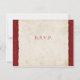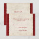 RSVP features cranberry red trim on the sides with a frilly pattern and torn parchment paper texture in the middle for a rustic and vintage country wedding feel.