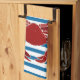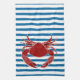 Bright blue and white horizontal pattern design kitchen towel features a nautical ocean theme with a red crab.