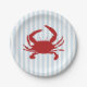 Enjoy our nautical red crab painting blue stripe paper plates for any party.