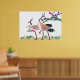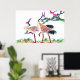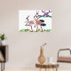 This Red Crowned Crane has two cranes under a tree with a white back ground each crane has a pink beak and pink orange feathers standing under the tree branch with the pink flower and a white back ground.this is a beautiful photo.on this poster