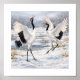 Known in Japan as symbols of longevity, harmony, and enduring bonds, these elegant birds are depicted with a focus on atmosphere, balance, and movement rather than strict scientific detail. The snowy fields and soft winter light create a calm, timeless scene that invites quiet contemplation.