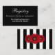 This Wedding Registry card is part of the Wedding Collection "Red Daisies and Stripes". The design features an elegant black front with the reverse side showing clusters of red Gerbera daisies and bold horizontal stripes in black and white. This personalised wedding registry card is used as an insert to wedding invitations to inform guests of where the bride and groom are registered. Personalise with your names and registry store locations by selecting "Customise It" and adding your information using the template on the right side of the screen. Choose from a variety of wedding day planning needs to prepare for your special day.