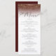 An elegant wedding menu card designed with a rich burgundy background adorned with classic damask decorative lace at the top, featuring ornate and sophisticated detailing with capitalised headings and refined typography, creating a timeless, formal, and artistic presentation for a wedding celebration.