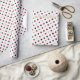 This roll of wrapping paper features a polka dot pattern with red and dark blue teal and pale jade green dots on winter white.