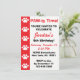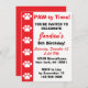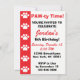 This invitation displays a red stripe with white paw prints and the text "PAW-ty Time! You're invited to celebrate..." These are great invitations for paw print themed, dog themed, puppy themed, cat themed, or animal themed birthday parties for children.