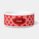 Red dog paw print pattern background with a darker red badge that has a personalizable text area for the name of the pet. The font is a lovely script font in white colour.