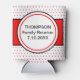 Personalised Family Reunion can coolers for everyone. Personalise with your family's last name in capital letters and date of event. Geometric red polka dots on white background. Back is solid red colour. Fun summertime pattern for get together's with family and friends. Original artwork and design © TamiraZDesigns.