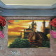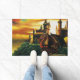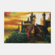 A side profile of a majestic red dragon perched on the edge of a rugged cliff, it is silhouetted against a sunset sky. Behind the dragon is a castle. The warm hues of the setting sun bathe the scene in rich oranges, yellows and reds.
