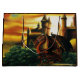 A side profile of a majestic red dragon perched on the edge of a rugged cliff, it is silhouetted against a sunset sky. Behind the dragon is a castle. The warm hues of the setting sun bathe the scene in rich oranges, yellows and reds.