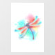 Red, flying, artistically drawn, in bright colours with textured iridescent, blue wings on white background, painted over with splashes of watercolor paint. Bright red dragonfly.