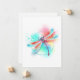 Red, flying, artistically drawn, in bright colours with textured iridescent, blue wings on white background, painted over with splashes of watercolor paint. Bright red dragonfly.